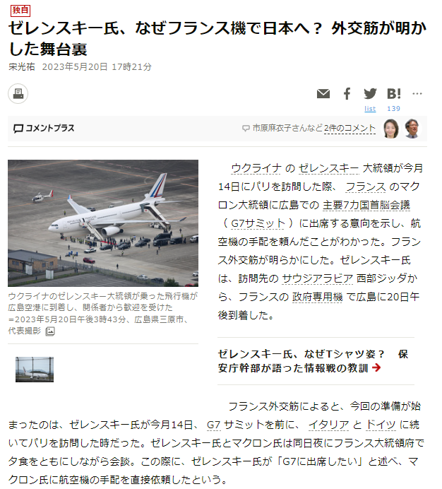 面白いですよね、NHKさんを初め、日本のメディアは「G7がやって来た!ゼレさんがやって来た!ウェーイ!!」と大はしゃぎなのに、この見出しには「日本」も「広島」も出て来ないし、話題の中心はゼレさんの物乞い外交なのです。