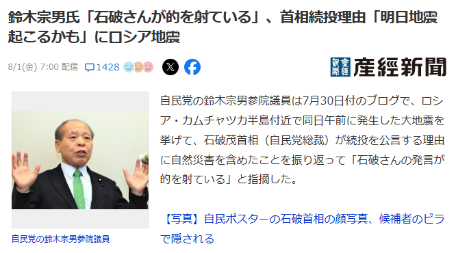 今年の春から「大災害予言」続きでしたから、予言成就に向けて頑張ったのかと思うような事象だったのですが、そういえば我らが石破首相、7月20日の参院選で与党の過半数割れを招いたにも拘わらず翌日には続投を表明。その理由の一つが